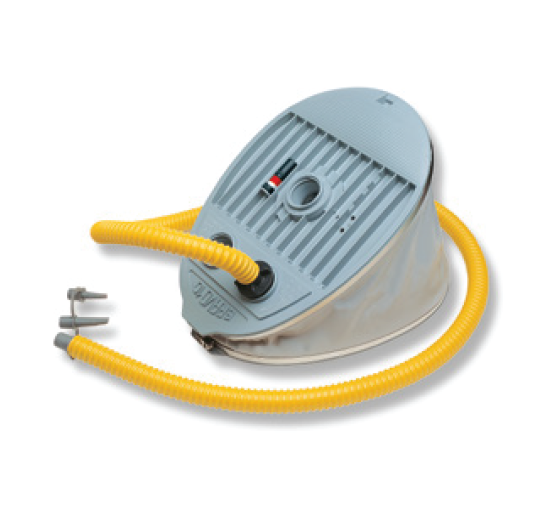Die Bravo 10 Fußpumpe verwendet ein innovatives Design, um das Aufpumpen und Entleeren eines Schlauches so mühelos wie möglich zu gestalten. Sie hat zwei Kammern, eine 5-Liter-Kammer (hohes Volumen, niedriger Druck), die bis 2,1 psi aufbläst, und eine 1,6-Liter-Kammer (niedriges Volumen,, hoher Druck), die bis 4,4 psi aufbläst.