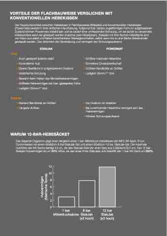 Das folgende Diagramm zeigt einen Vergleich eines 1 bar- Mitteldruck-Hebekissen (ein MFC AK-Sack, 61cm Durchmesser) mit einem 62x62cm 8-bar-StakJak-Set und einem 62x62cm 12-ba- StakJak-Set. Die maximale Hubhöhe des AK-Sacks beträgt 43 cm, die des StakJak-Sets (für einen Satz aus 3 Säcken) 52,5 cm. Das 12 bar- Stakjak-Hubvermögen ist um 50% höher, als das eines 8 bar-StakJaks und übertrifft den 1-bar-AK-Sack um 290%.