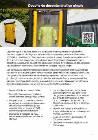 Légère et rapide à déployer, la douche de décontamination gonflable simple de MFC International permet de réagir rapidement en situation de décontamination. Entièrement gonflable, la douche se monte en quelques minutes et restera dressée sans gonflage continu. Sans aucun cadre mécanique, ces abris sont légers à transporter et compacts pour le rangement. Les douches peuvent être utilisées sur un socle dur ou souple, et des cordes de haubanage sont fournies pour les maintenir en place par mauvais temps.