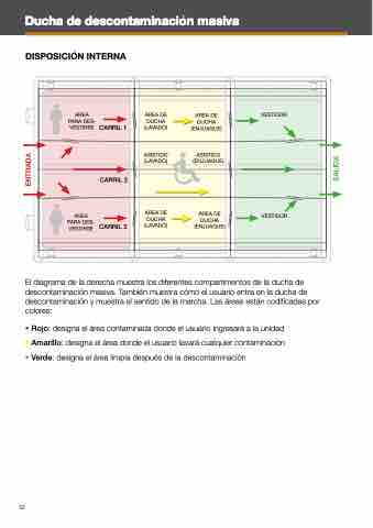 • Rojo: designa el área contaminada donde el usuario ingresará a la unidad • Amarillo: designa el área donde el usuario lavará cualquier contaminación • Verde: designa el área limpia después de la descontaminación