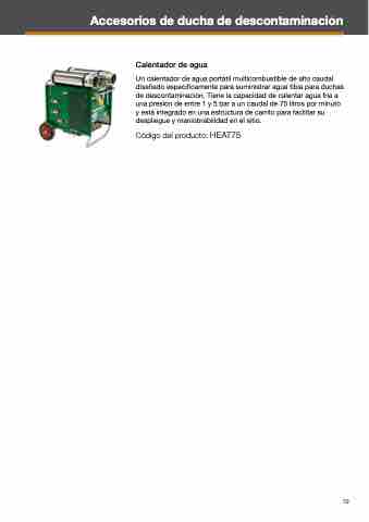 Un calentador de agua portátil multicombustible de alto caudal diseñado específicamente para suministrar agua tibia para duchas de descontaminación. Tiene la capacidad de calentar agua fría a una presión de entre 1 y 5 bar a un caudal de 75 litros por minuto y está integrado en una estructura de carrito para facilitar su despliegue y maniobrabilidad en el sitio.
