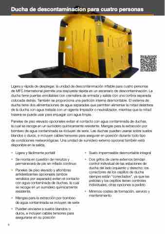 de MFC International permite una respuesta rápida en un escenario de descontaminación. La ducha tiene puertas enrollables con cremallera de entrada y salida con una cortina separada colocada detrás. También se proporciona una partición interna desmontable. El sistema de ducha tiene dos alimentaciones de agua separadas que permiten alimentar la mitad delantera de la ducha con agua tratada con un agente limpiador o neutralizador, mientras que la mitad trasera se puede usar para enjuagar con agua limpia.