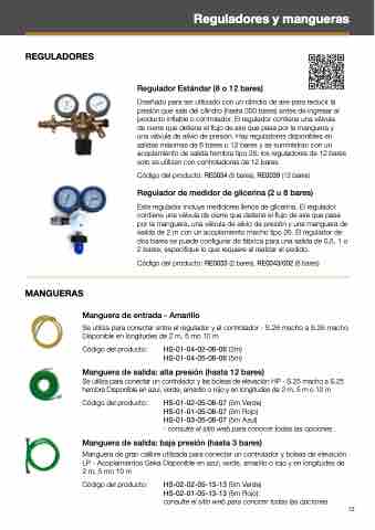 de cierre que detiene el flujo de aire que pasa por la manguera y una válvula de alivio de presión. Hay reguladores disponibles en salidas máximas de 8 bares o 12 bares y se suministran con un acoplamiento de salida hembra tipo 26; los reguladores de 12 bares solo se utilizan con controladores de 12 bares.
