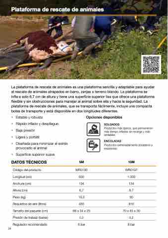 La plataforma de rescate de animales es una plataforma sencilla y adaptable para ayudar al rescate de animales atrapados en barro, zanjas o terreno blando. La plataforma se infla a solo 6,7 cm de altura y tiene una superficie superior lisa que ofrece una plataforma flexible y sin obstrucciones para manejar al animal sobre ella y hacia la seguridad. La plataforma de rescate de animales, que se transporta fácilmente, incluye una compacta bolsa de transporte y está disponible en dos longitudes diferentes.