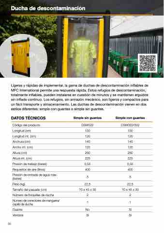 Ligeras y rápidas de implementar, la gama de duchas de descontaminación inflables de MFC International permite una respuesta rápida. Estos refugios de descontaminación, totalmente inflables, pueden instalarse en cuestión de minutos y se mantienen erguidos sin inflado continuo. Los refugios, sin armazón mecánico, son ligeros y compactos para un fácil transporte y almacenamiento. Las duchas de descontaminación vienen en dos estilos diferentes: simple con guantes o simple sin guantes.