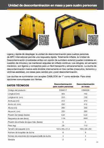 de MFC International permite una respuesta rápida. Totalmente inflable, la Unidad de Descontaminación (mostradas arriba con opción de sumidero exterior) pueden instalarse en cuestión de minutos y se mantienen erguidas sin inflado continuo. Los refugios, sin armazón mecánico, son ligeros y compactos para un fácil transporte y almacenamiento. La ducha de descontaminación masiva está dividida internamente en tres carriles (masculino, femenino y víctimas asistidas), con áreas para cambio pre y post descontaminación.